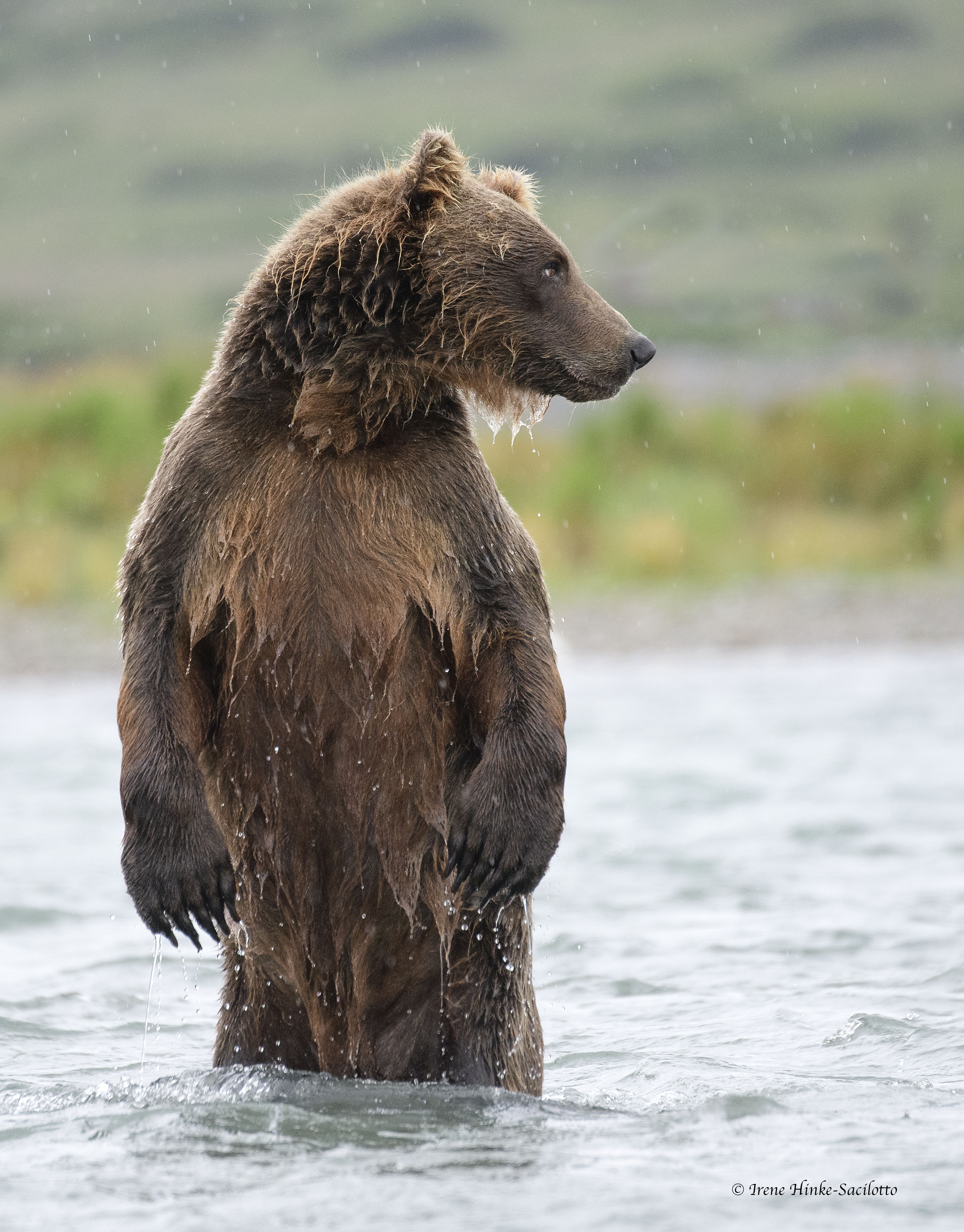 The guides at McNeil River State Game Sanctuary were very knowledgeable about bear behavior and made it clear that our activities would not alter the animal’s activity. Part of the safety protocol was that neither guides or visitors were to surprise the bears. Hunan movement was to be consistent and nonaggressive, so the bears perceived humans as no threat. Group sizes were limited to no more than 10. Times of excursions and routes taken were roughly the same each day. As we hiked and whenever we stopped to photograph, we were required to stay in a tight group with no one making sudden movements, sounds, or bounding away from the group for a better photo. When leaving a location, we were reminded to be sure to leave nothing behind, particularly food scraps. The bears were allowed to decide their path and how close to approach. When we rounded blind corners or entered areas of heavy vegetation, the guide would repeat in a low voice phrases such as “hey bear”. If a bear seemed to be overly focused on us and could possibly be a threat, the guide used the least contentious aversion technique to dissuade it, such as clicking two stones together. This was never necessary. On several occasions, a bear passed by within 12 feet from the nearest member of our group and just slowly sauntered by. In the unlikely event of an attack, the guides do carry a 12-guage shotgun slung over their shoulder or lashed to side of their pack.