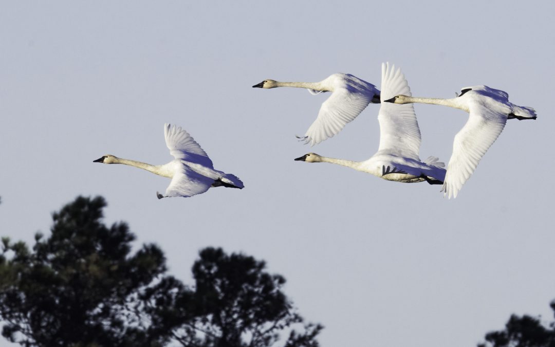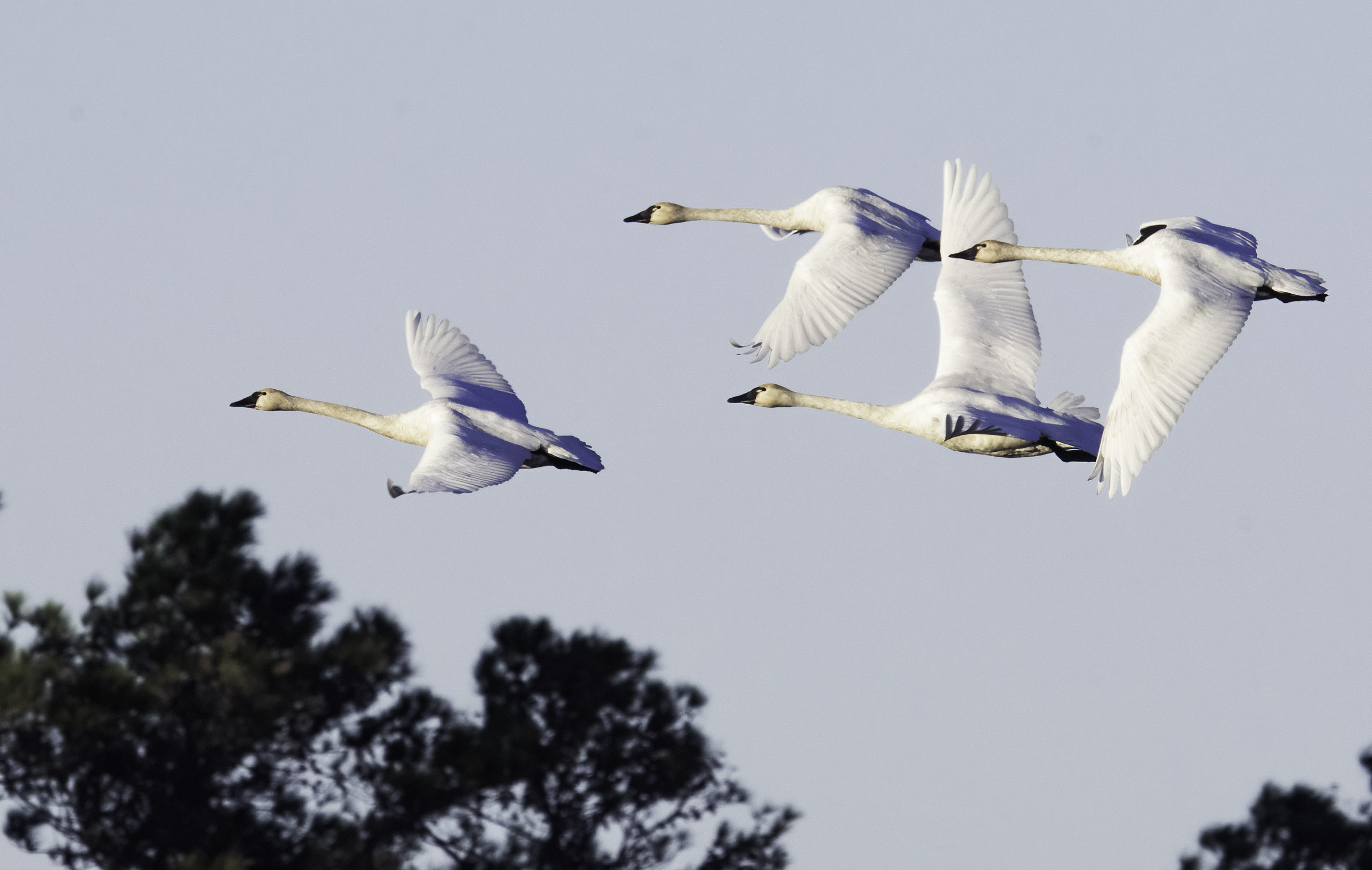 Swan4FlyingPastPine-3740CRDN1lessblueshaow0V2 copy by Osprey Photo Workshops & Tours | Feb 14, 2022 Tundra Swans flying over trees.